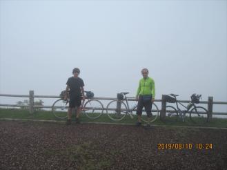 竜飛ラインを眺瞰台へ登る ガスって気温18度、何も見えない 眺瞰台から岩木山が見える・・・・はずもない